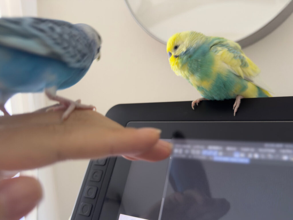 作業の手伝いがうますぎることで定評のあるインコたちの様子をどうぞ。